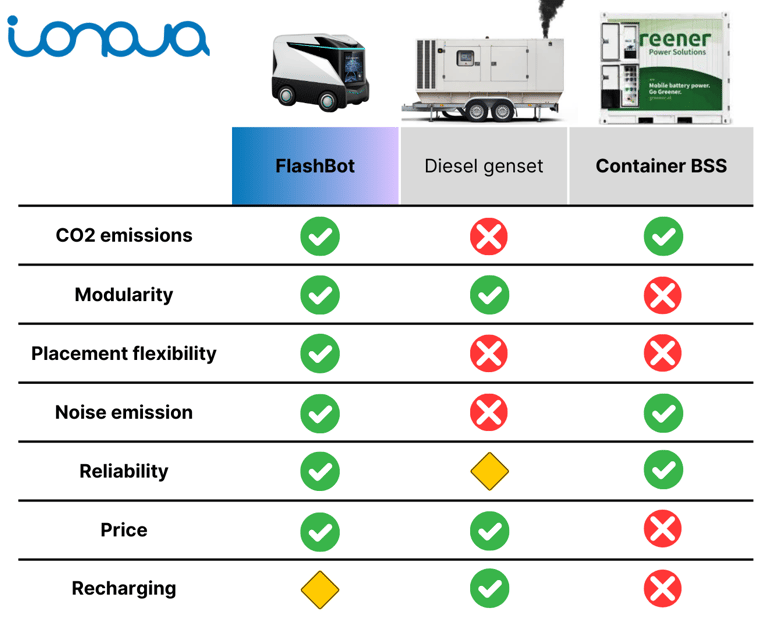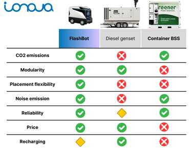The FlashBot offers numerous advantages over diesel generators and containerized battery storage systems.